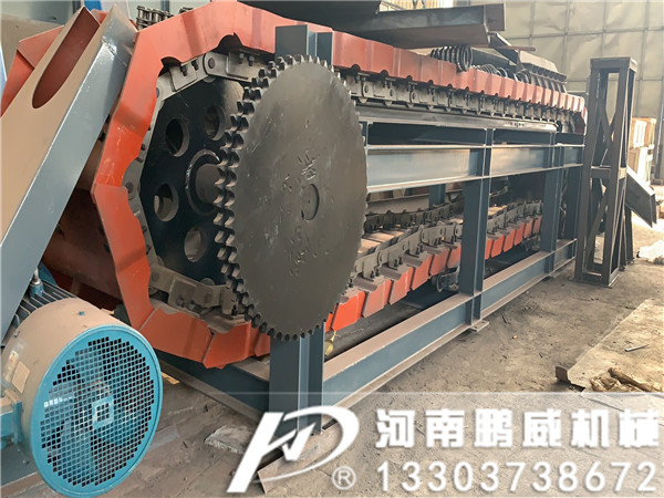 鏈板機結(jié)構(gòu)設(shè)計合理,使用性能好,運行阻力小,易損零件少,操作安全,維修方便,運行可靠,使用壽命長。鏈板機可水平或傾角<30°安裝,傾斜安裝時,配有棘輪逆止機構(gòu)。輸送鏈板上的輥輪在導軌上滾動,輸送鏈與機殼無磨擦;鏈條采用合金鋼熱處理加工制成,其正常使用壽命3年左右,運行中故障率低。除頭尾軸承外,輸送機中無潤滑點。鏈板機由頭部機架、頭部護罩、主動鏈輪組、輸料裝置、中部機架、尾部機架、改向鏈輪組,鏈板托輪組和驅(qū)動裝置組成。驅(qū)動裝置由柱銷聯(lián)軸器、JZQ減速機、驅(qū)動底座組成。分右裝和左裝兩種,從機尾向輸送方向看,驅(qū)動裝置在右側(cè)為右裝,在左側(cè)為左裝。鏈輪采用組裝式結(jié)構(gòu),由鑄鋼鏈輪圈與鏈輪芯用螺栓聯(lián)結(jié)組合,耐磨性能強,便于拆卸安裝。主動鏈輪采用窩眼鏈輪圈,防止環(huán)鏈運行中滑動。
