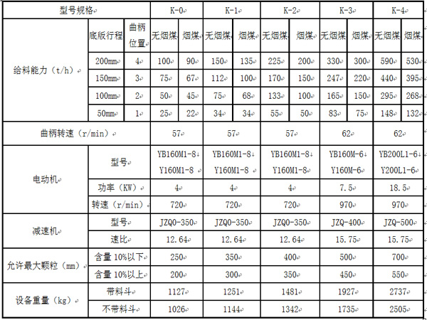K型往復(fù)式給煤機由機架、底板(給煤槽)、傳動平臺、漏斗、閘門、托輥等組成。當(dāng)電機開動后經(jīng)彈性聯(lián)軸器、減速機、曲柄連桿機構(gòu)拖動傾料5°的底板在輥上作直線往復(fù)運動,煤均勻地卸到其他設(shè)備上。